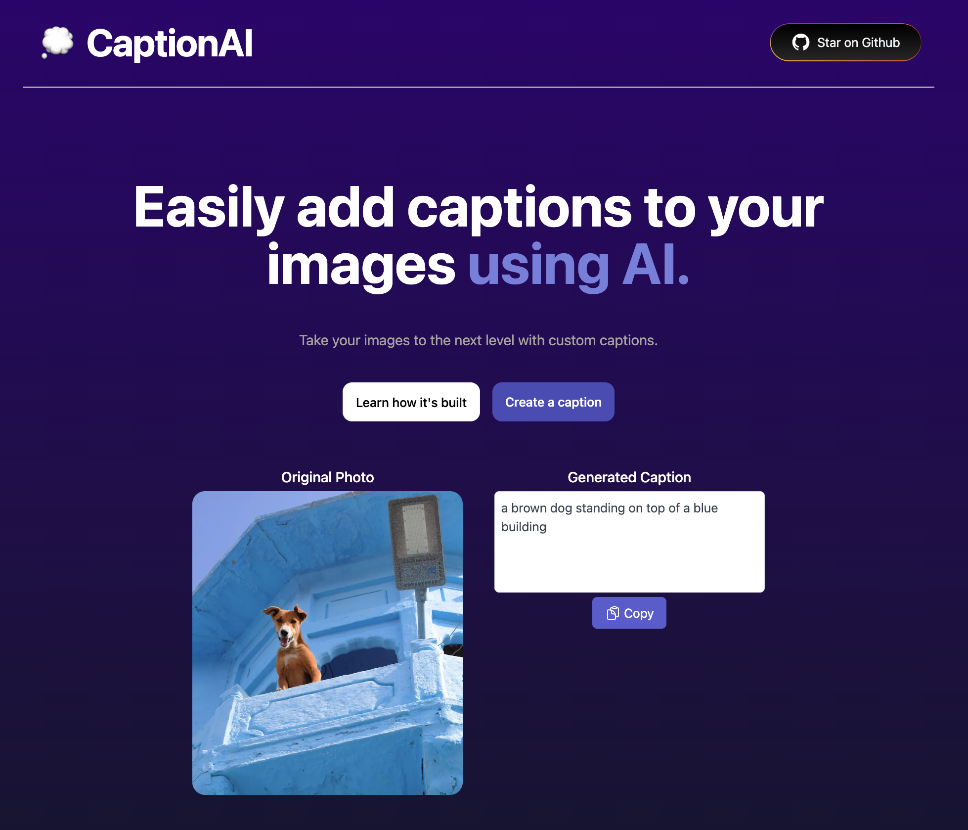 In this article, I'm going to discuss how I built CaptionAI, a web application that allows users to upload an image and receive an AI generated text caption. I built this project using this Vercel template. There is also this video explaining how this project was built.