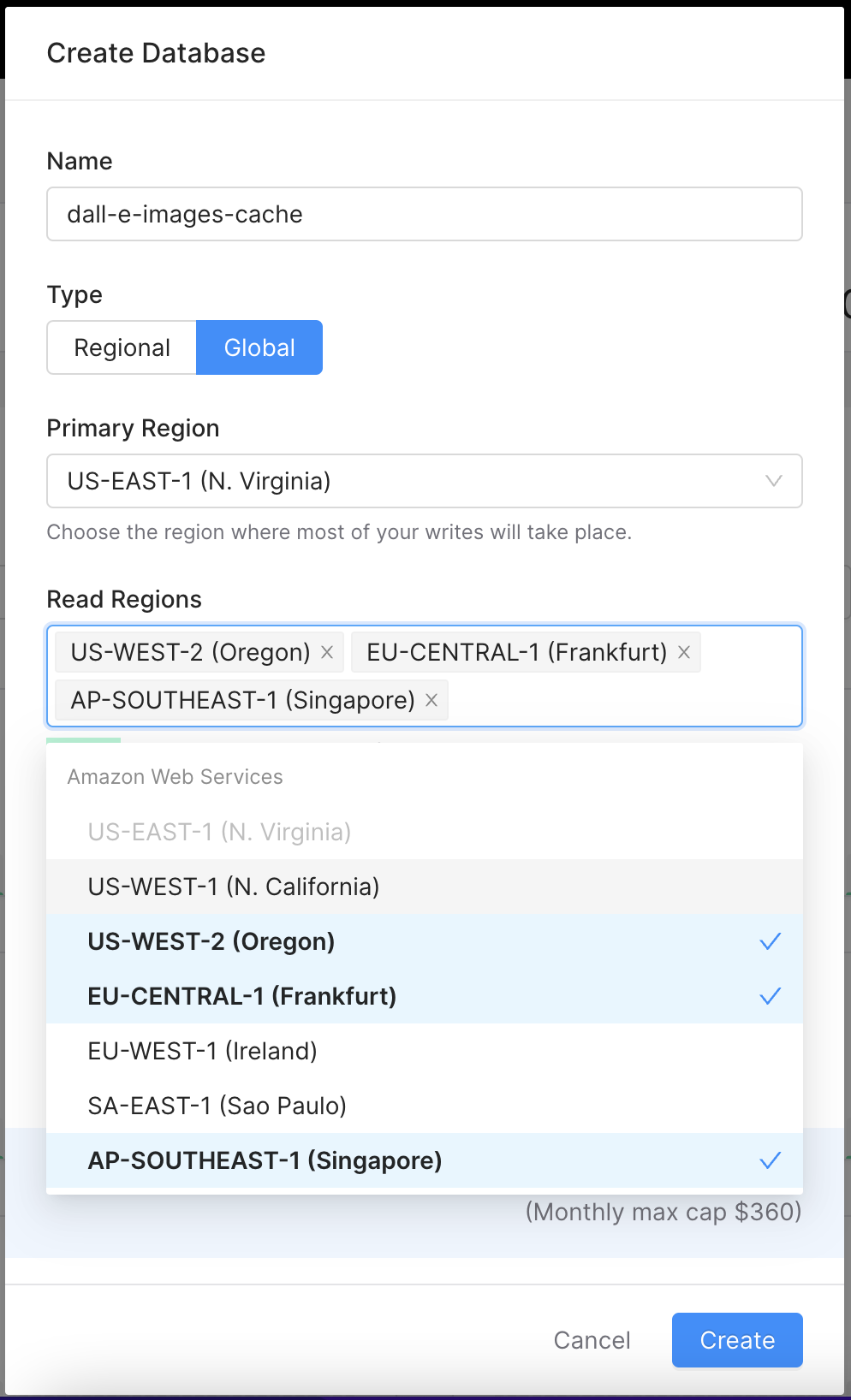 New global database asks you to choose primary and read regions.