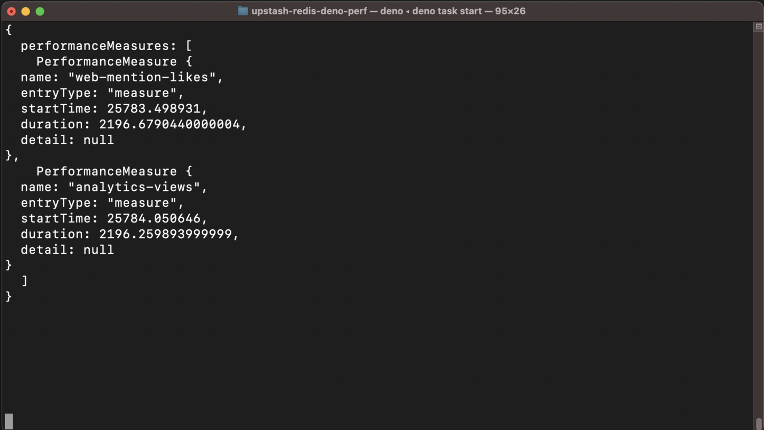 I hope you found reading about Upstash for Redis and the Performance API valuable. If you are new to Deno or Deno Fresh, take a look at some of the content I have created on getting started with Deno. You can open the full code for the app on GitHub.