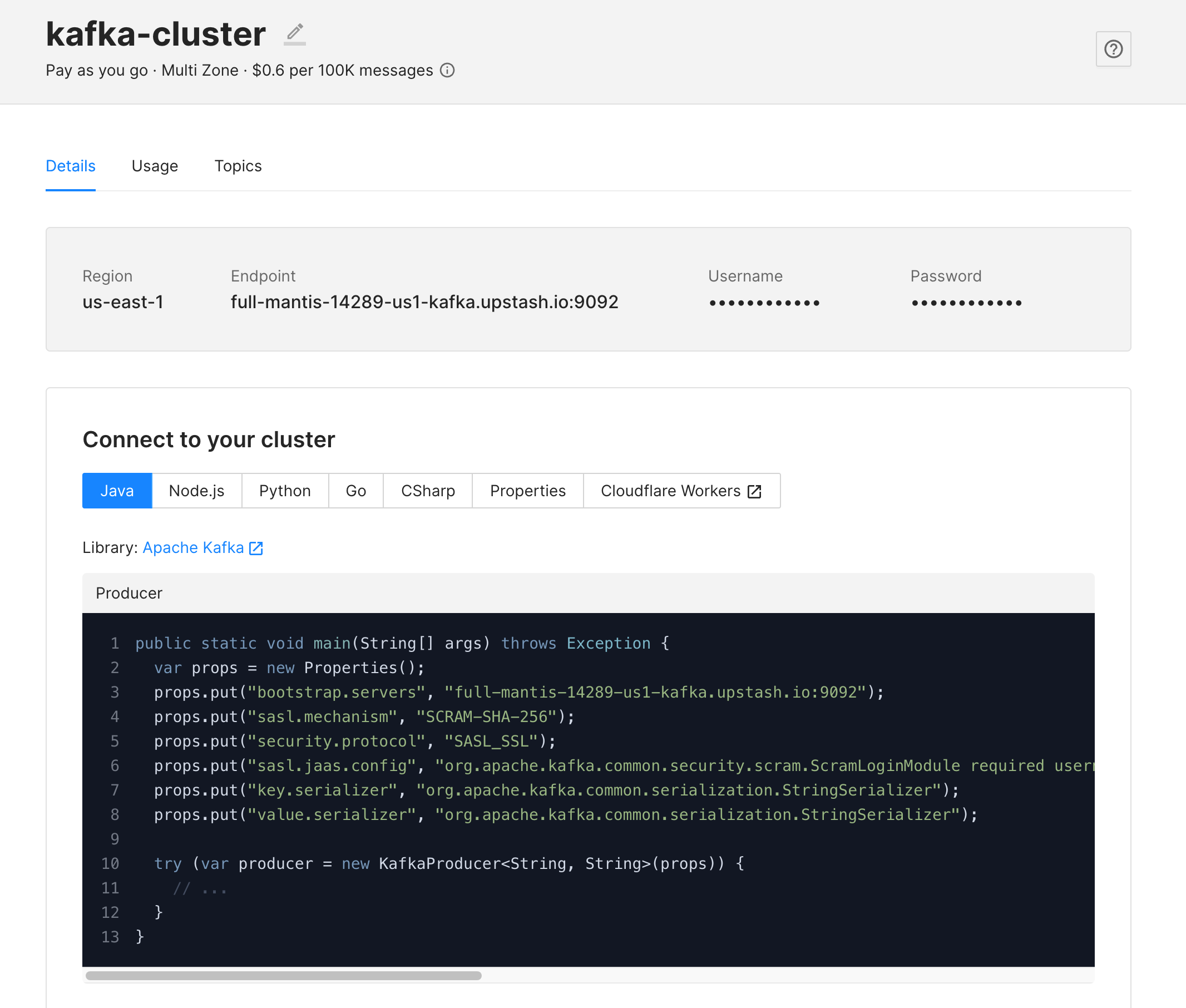 If you don’t already have an Upstash account, you can sign up here. You’ll see the Upstash console afterward. Select the Kafka tab at the top. Now, you need a Kafka cluster. Click the Create Cluster: